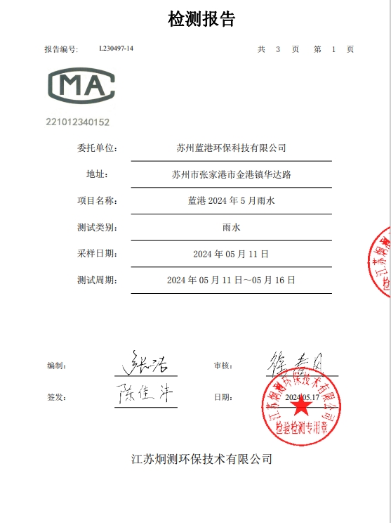 蘇州藍(lán)港環(huán)保科技有限公司檢測報告已公示,詳情請查...